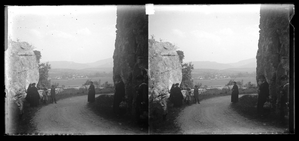 Groupe de femmes et d'enfants sur la route, en revenant de l'ermitage Notre-Dame de Lorette à Port-Lesney.