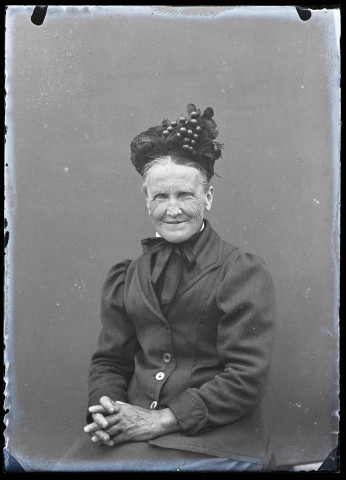 Portrait assis d'une femme âgée portant une coiffe ornée d'une grappe de raisin.
