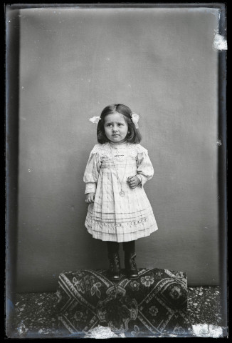 Portrait d'une fillette portant une robe rayée.