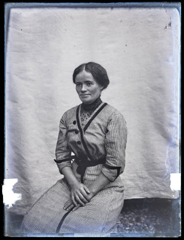 Portrait d'une femme assise portant une robe à petits carreaux.