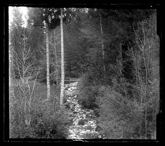 Cours d'eau à sec bordé d'arbres.