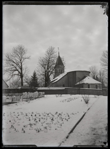 Vue de l'église Saint-Laurent de Vers-en-Montagne sous la neige prise depuis un jardin, du linge sèche.