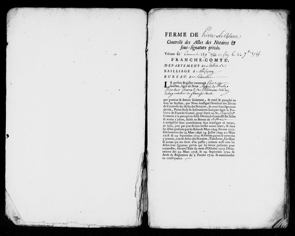Le contrôle des actes des notaires fut institué en Franche-Comté sur le modèle du royaume de France en 1693, celui des actes sous seings privés en 1705. Des bureaux furent ouverts dans les villes et principaux bourgs, la plupart d'entre eux accueillant le siège d'un bailliage. Parmi les plus modestes bureaux, certains n'ont eu qu'une existence éphémère, tels ceux de Conliège et de Villers-les-Bois. D'autres se sont déplacés : celui de Cuisia est passé d'abord à Beaufort puis à Cousance, avec des retours périodiques à Cuisia ; celui des Planches a été transféré à Foncine, celui de Taxenne à Gendrey, celui d'Offlanges à Montmirey et celui de Vitreux à Pagney.