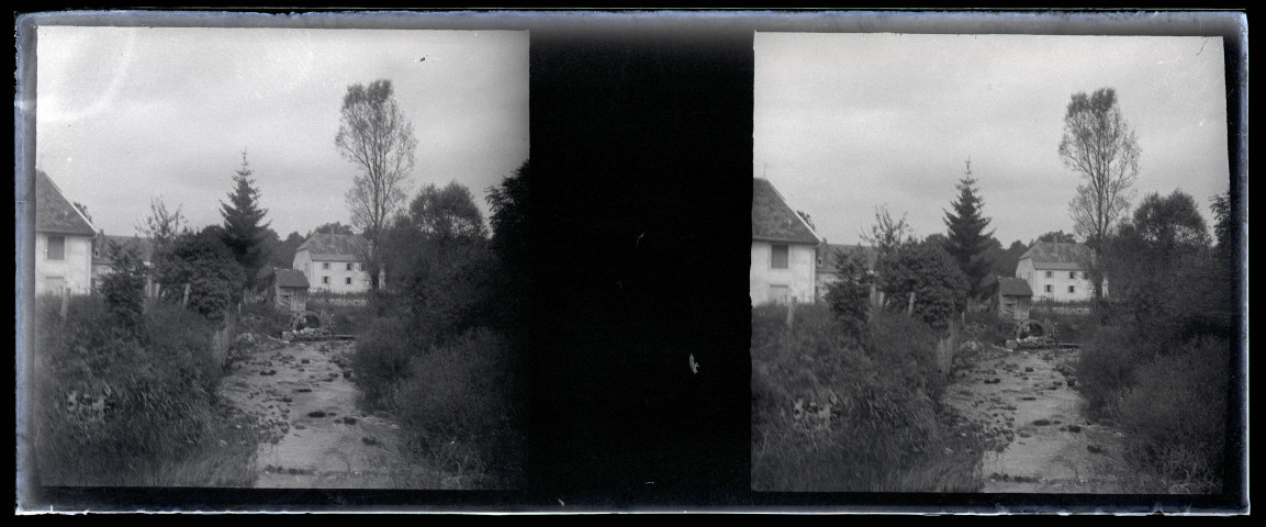 Vue de Vers-en-Montagne avec en arrière plan la roue à aubes du petit moulin.