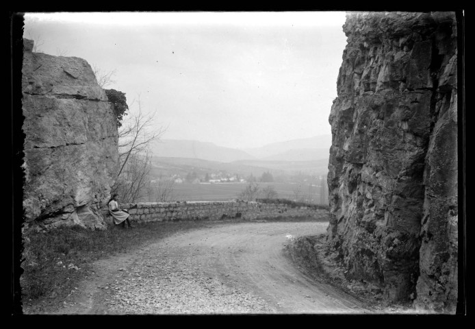 Chemin menant à la chapelle de l'ermitage Notre-Dame de Lorette, à Port-Lesney, une jeune femme est assise sur un muret.